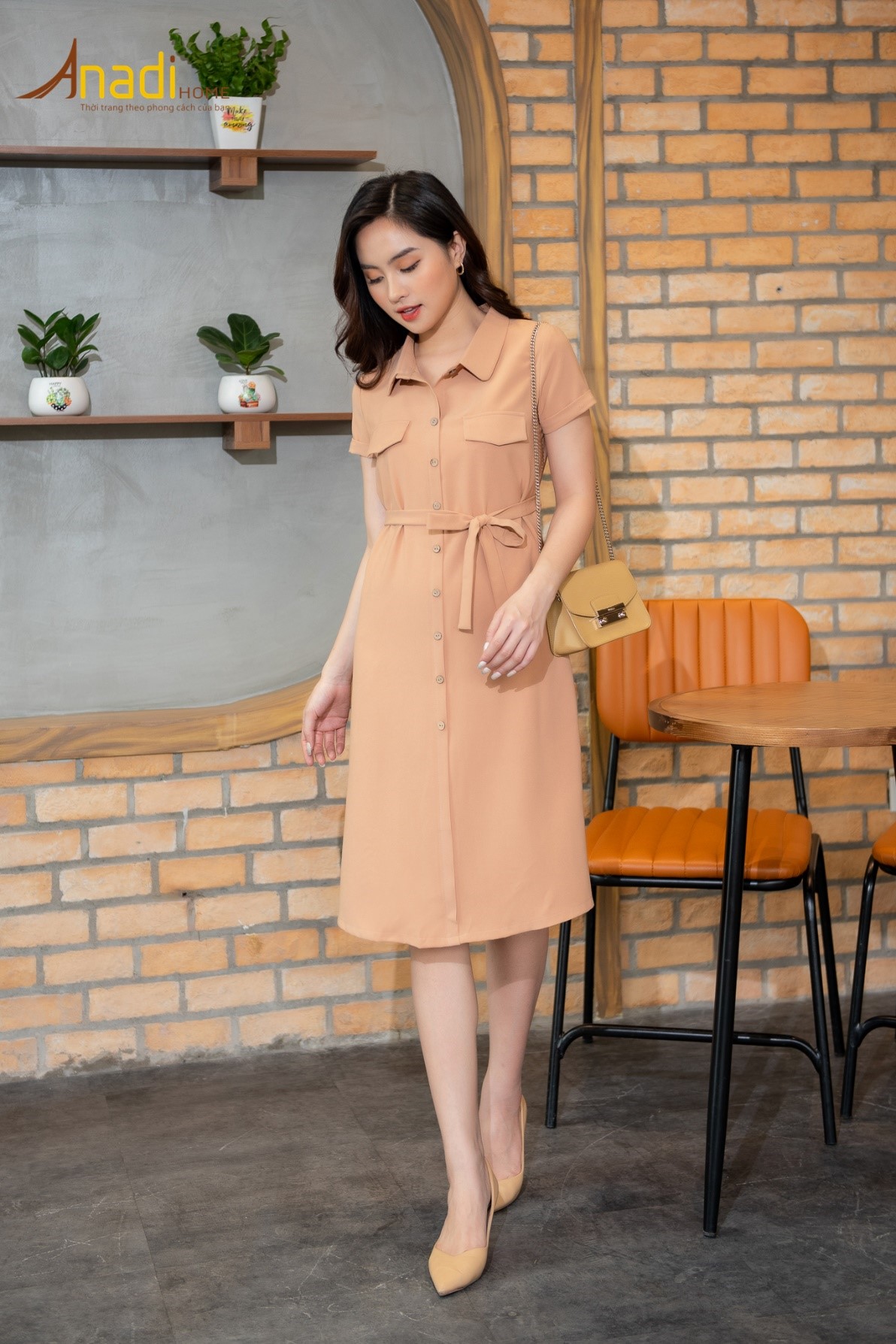 Đây là một trong những thiết kế đầm không thể thiếu trong tủ đồ của Nàng công sở ngày hè được. Đơn giản, nữ tính nhưng vô cùng chuyên nghiệp là những điều Nàng sẽ cảm nhận khi diện em nó lên người. Thiết kế cổ Đức đơn giản kết hợp cùng màu be nhẹ nhàng. Phần eo được Anadi thiết kế là dải buộc cố định bằng dây nơ hoặc tạo hình từ các băng vải cuốn quanh cơ thể giúp như điểm nhấn cho chiếc đầm.