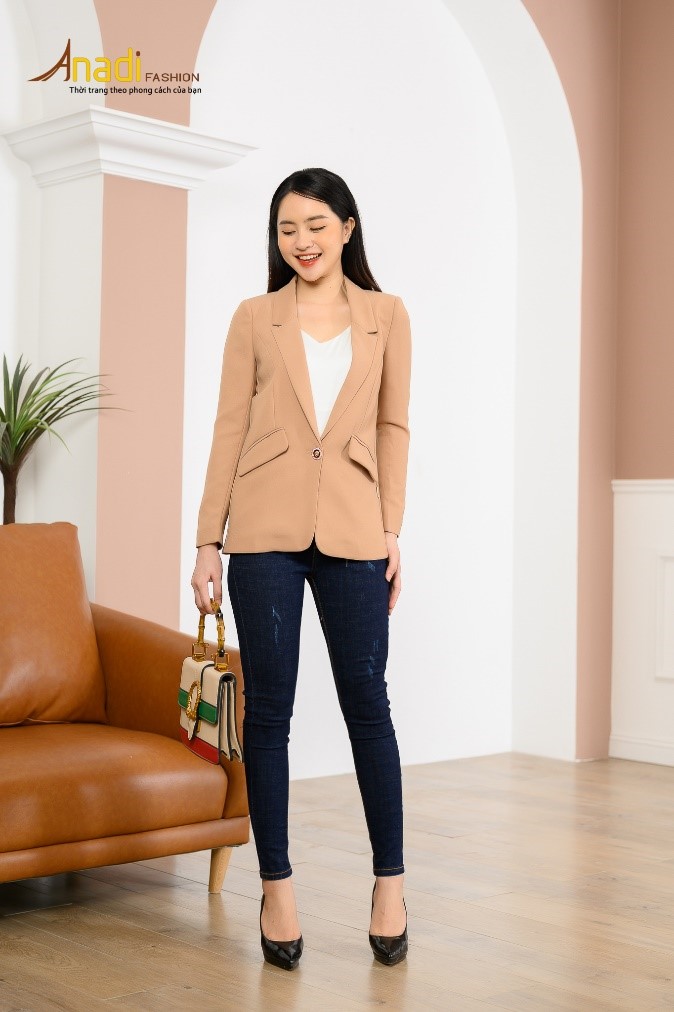 Nếu không quen với cảm giác có phần hơi khuôn khổ mà những chiếc áo vest tạo ra thì bạn có thể thử mặc một chiếc blazer xem sao nhé. Chất liệu của blazer của Anadi là vải trượt Hàn cao cấp lên dáng rất chuẩn. Thiết kế Blazer rộng có khả năng tạo hiệu ứng về sự năng động và thoải mái nhiều hơn so với vest. Để kết hợp cùng với blazer, bạn có thể lựa chọn một chiếc quần jeans cá tính